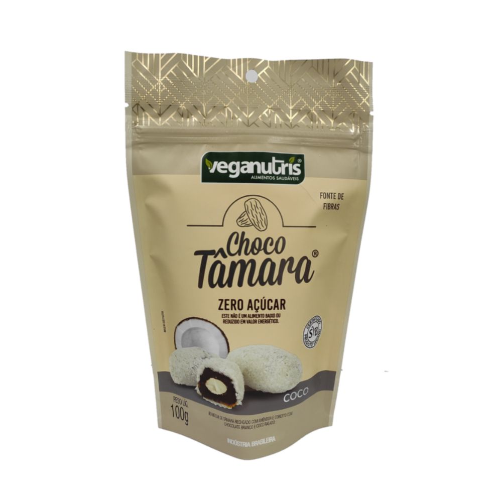 Ingredientes: Tâmara, chocolate branco ao leite de coco (manteiga de cacau, leite de coco em pó, polidextrose, fibra de bambu, edulcorantes maltitol, emulsificantes lecitina de girassol e poliglicerol polirricinoleato), amêndoa e coco ralado sem açúcar.