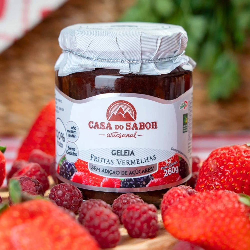 Desfrute do sabor autêntico e da qualidade artesanal da Geleia de Frutas Vermelhas sem adição de açúcares Casa do Sabor, feita com frutas frescas selecionadas para momentos deliciosos.