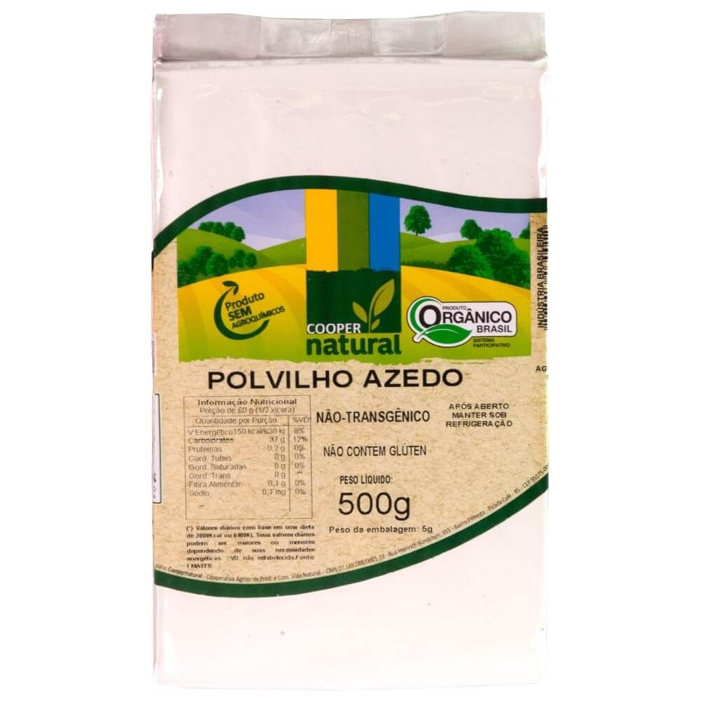 O Polvilho Azedo Orgânico da Coopernatural é um produto derivado da mandioca orgânica, livre de transgênicos e agrotóxicos. Com a fécula de mandioca como único ingrediente, garante pureza e qualidade em cada porçãoCom valor energético de 150KCAL=630KJ, 37,0g de carboidratos e 0,2g de proteínas por porção de 60.